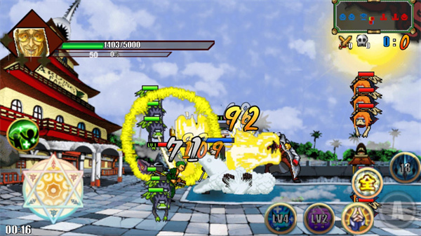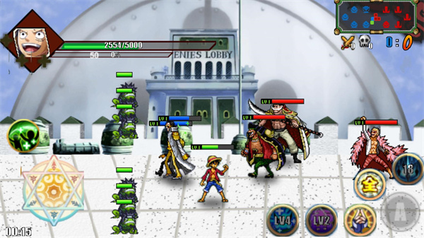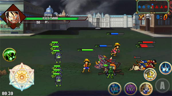 在海贼王战记游戏中,玩家于主页面选定模式与角色后,即可开启对战。操作方面,屏幕左边用于操控角色移动,右边则负责普通攻击与技能释放。玩家在对战中击败对手可获取经验,借此提升等级进而解锁新技能,游戏目标为摧毁对方的防御塔与基地。此外,这款游戏拥有大量丰富的海贼王角色,其技能高度还原原作,同时还支持团队组建以及策略搭配。