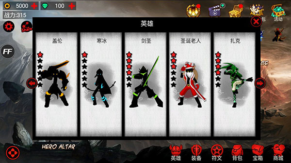 这里有多种火柴人英雄供您挑选,像盖伦、寒冰、铁拳、刀妹、子龙、武僧,还有暗影忍者等等。