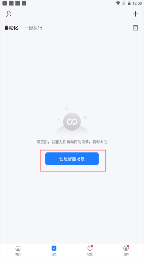 1. 在下方菜单栏中找到【场景】,然后点击中间仅有的“创建智能场景”按钮。