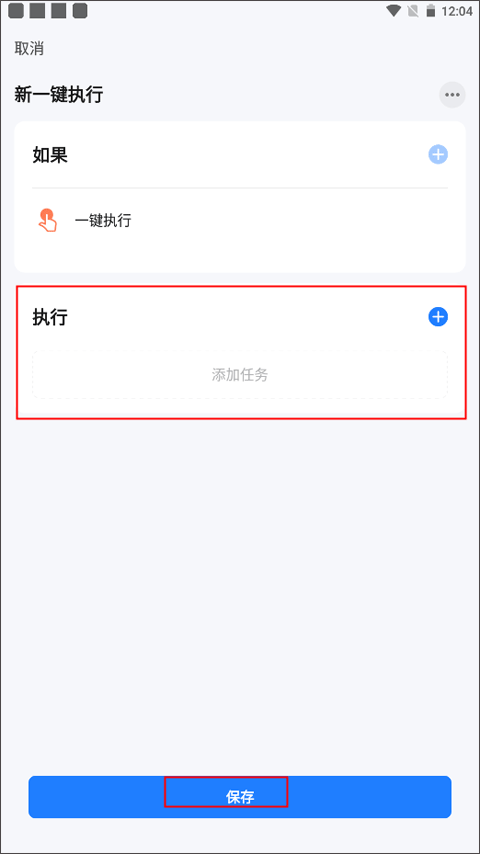 3、进入执行操作编辑界面,在执行右侧的“+”处添加任务与设备,最后点击保存,就能执行相关操作。