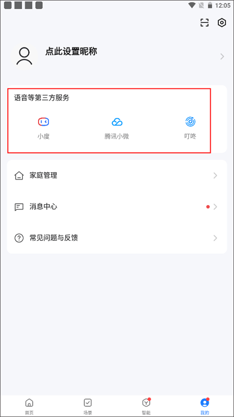 1. 点击切换至【我的】界面,在“语音等第三方服务”里,你能够连接小度、腾讯小微、叮咚等相关智能音箱。