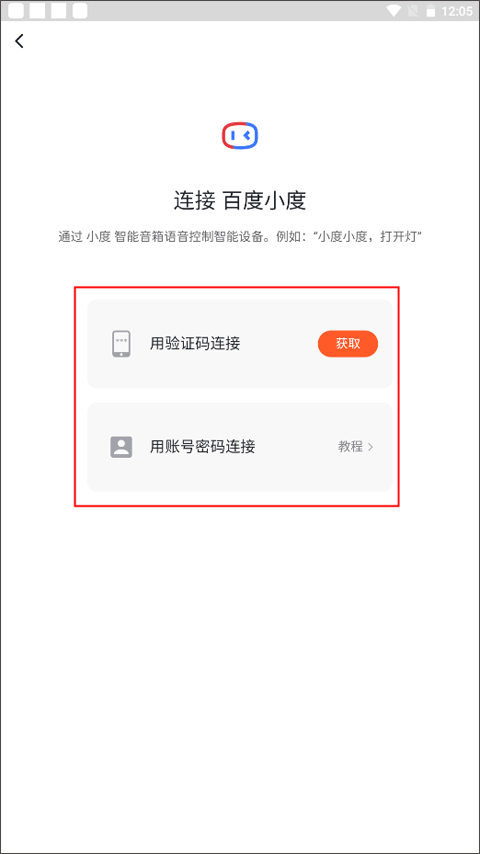 2、选择连接小度,进入设备连接界面,此界面提供两种连接方式,分别为:使用验证码连接以及使用账号密码连接。