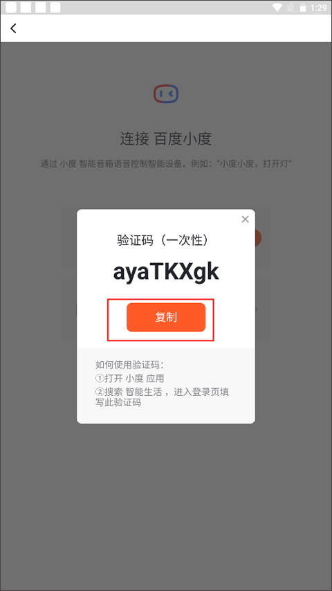 3、关于验证码连接方式,需先把验证码复制并粘贴至文本框,接着打开小度应用,搜索“智能生活”,进入登录页面后填写该验证码。至于账号密码连接,按照其提供的相关教程逐步操作即可。