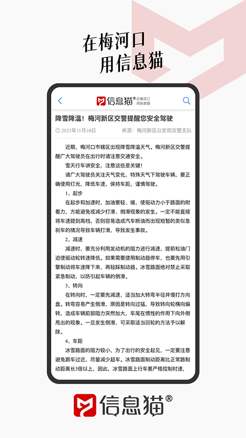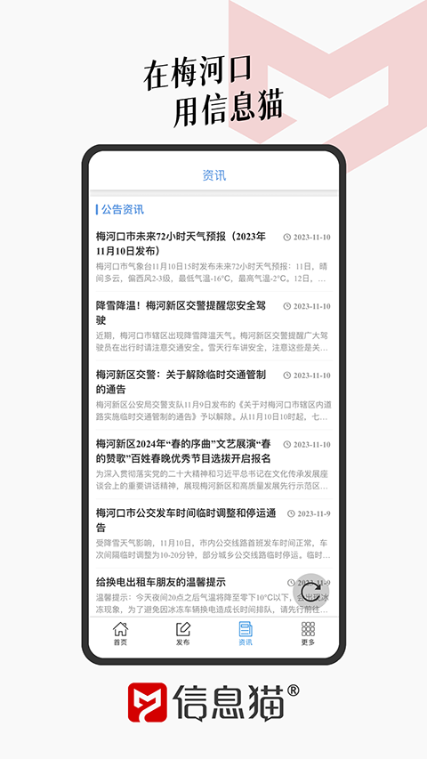 2. 内容丰富:和梅河口网站数据实现实时同步,整合了新鲜的生活信息、公告资讯以及本地常用查询内容。