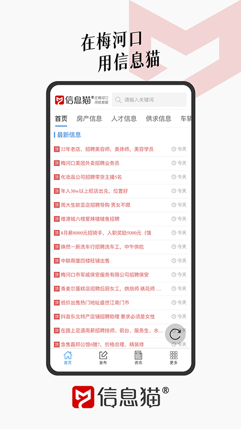 信息猫,乃是梅河口生活网(又称梅河口信息网)的全新升级版本。该软件内部数据与梅河口网站的数据保持实时同步状态,始终致力于为用户呈上最新鲜、最一手的梅河口生活资讯。不管你所需的是哪方面信息,无论是人才招聘需求,还是买卖车辆的诉求,在此处都能迅速达成,助力用户一键寻得自身所需内容。而且,这款软件使用起来极为便捷,既无繁杂的软件界面设计,也不存在病毒弹窗以及恼人的公告弹窗,确保用户在使用过程中体验到简洁清爽的环境,所有所需内容只需点开信息就能浏览。所以,有需求的用户,赶紧来本站免费体验一番吧。
