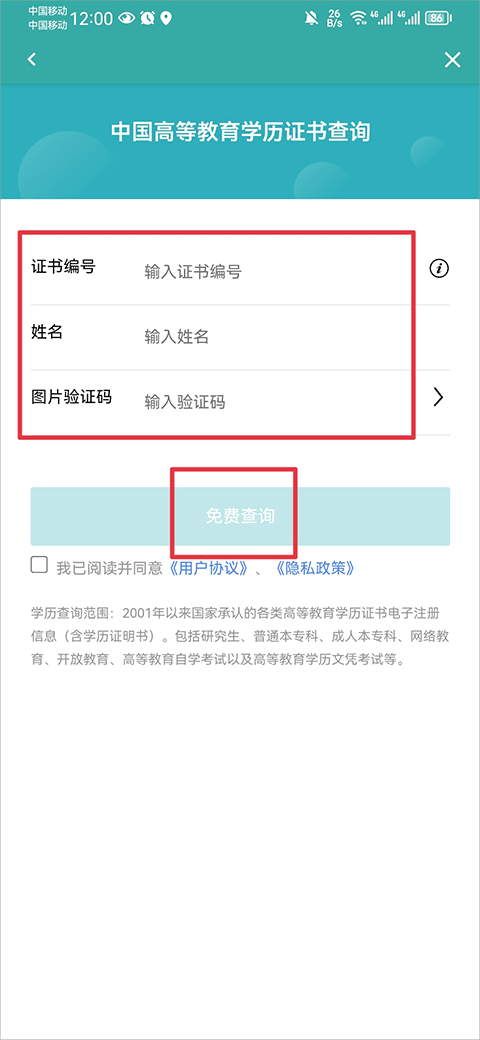 2、当进入中国高等教育学历证书查询界面后,依据要求填写证书编号、姓名,并输入图片验证码,随后点击免费查询。