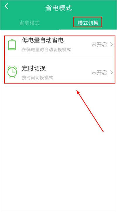 3、点击【模式切换】,在此处可进行自动设置:用户能够设置在电量较低时自动开启省电模式,也可以选择定时开启省电模式,如此一来,能让用户更便捷地长时间使用手机。
